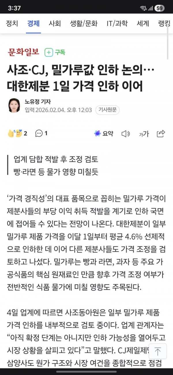 사조·CJ, 밀가루값 인하 논의.jpg 홍황제 0 6 02.05 13:35 https://n.news.naver.com/mnews/article/021/0002768861?sid=101