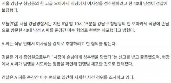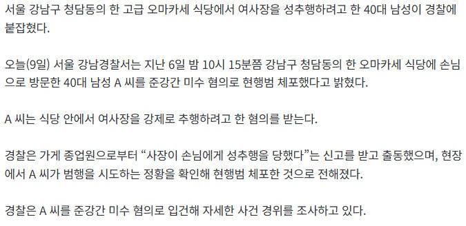 [단독] 청담동 고급식당에서 여사장 성추행한 40대 男 체포
