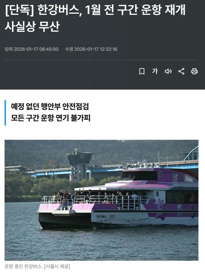[단독] 한강버스, 1월 전 구간 운항 재개 사실상 무산