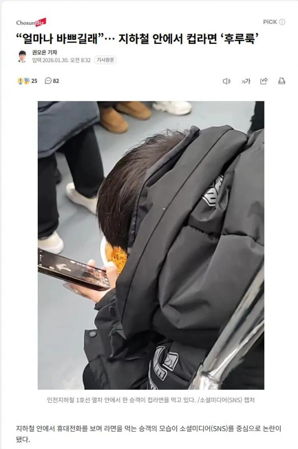 “얼마나 바쁘길래”… 지하철 안에서 컵라면 ‘후루룩’ 홍황제 0 1 01.31 16:24 내가 제일 싫어하는거1. 누가봐도 타기 어려운데 억지로 밀어서 타는 사람2. 스피커로 전화하는 사람3. 스피커로 유튜브 or 인스타그램 릴스 보는 사람4. 원기옥처럼 가래 모아서 뱉는 사람5. 사람 많아도 커피 들고 타는 사람6. 사람 많은데 다리 꼬고 앉아서 내 정강이 차는 사람7. 문 열리지도 않았는데 내리겠다고 문 앞까지 밀고 들어가는 사람이 외에도 많지만요즘 보면 공중도덕성이 점점 없어지고 있음