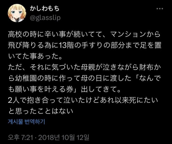고등학교 때 괴로운 일이 이어져 홍황제 0 1 02.02 12:27 고등학교 때 괴로운 일이 이어져 아파트에서 뛰어 내리기 위해 13층의 난간 부분에 다리를 디디고 있었다.다만, 그것을 깨달은 어머니가 울며 지갑에서 유치원 때 만들어 어머니의 날에 건네준 ‘뭐든지 소원을 이루는 티켓’ 을 꺼내서둘이서 껴안고 울었지만 그 이후로 죽고 싶었던 적은 없다7:21 PM · Oct 12, 2018